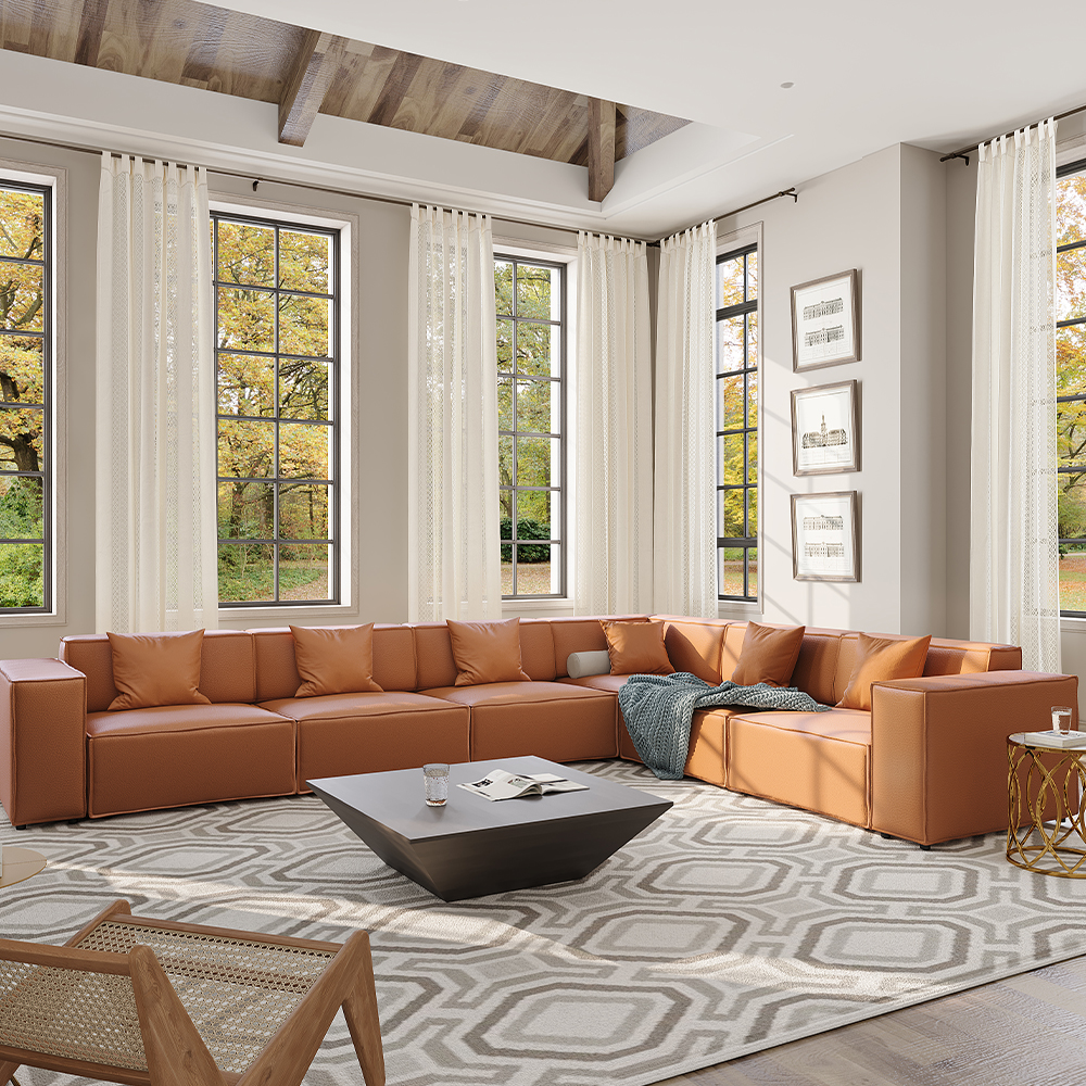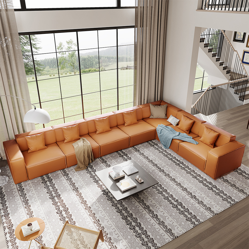 143.30" Modular Sofa, Sectional L-Shape Oversized Couch, Genuine Leather Sofa with Track Arm, Orange