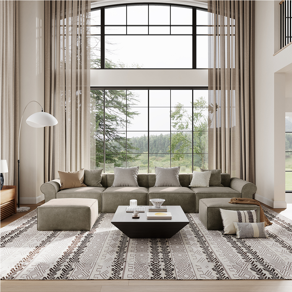 145.66" Roll Arm Modular Sofa with 2 Ottomans, Large Couch, Anti-scratch and Water-proof, Khaki