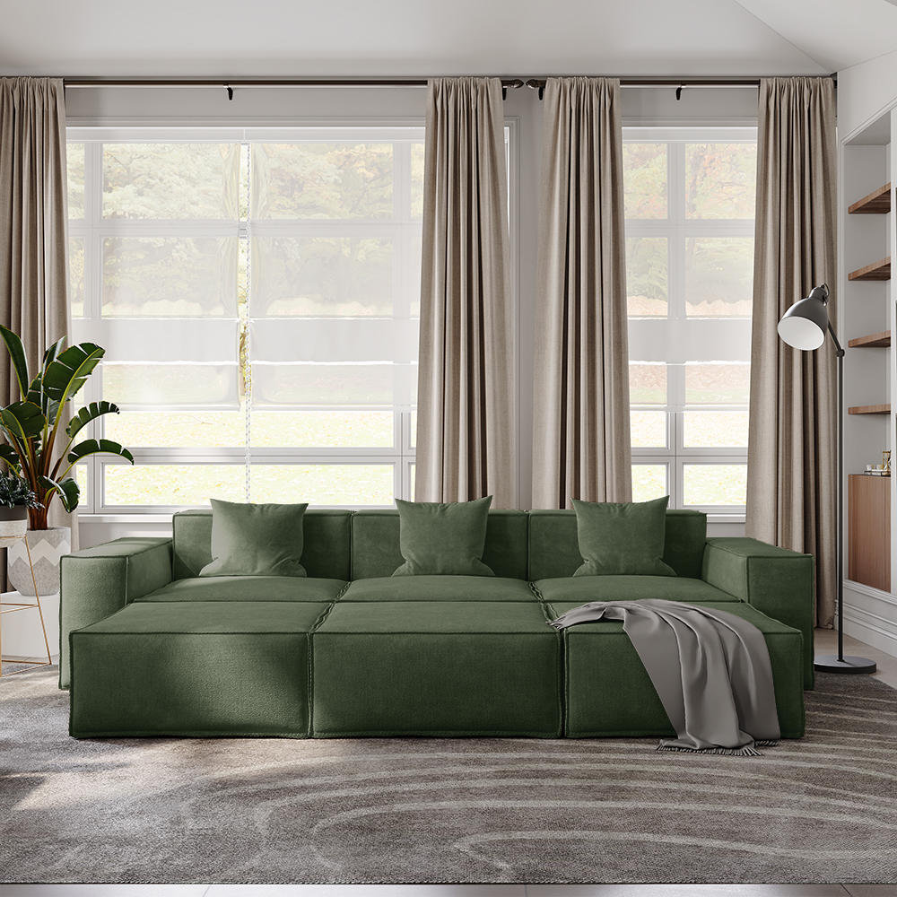 6-Seat Modular Daybed, Deep Seat Couch with 3 Ottomans, Anti-scratch and Water-proof Fabric, Green