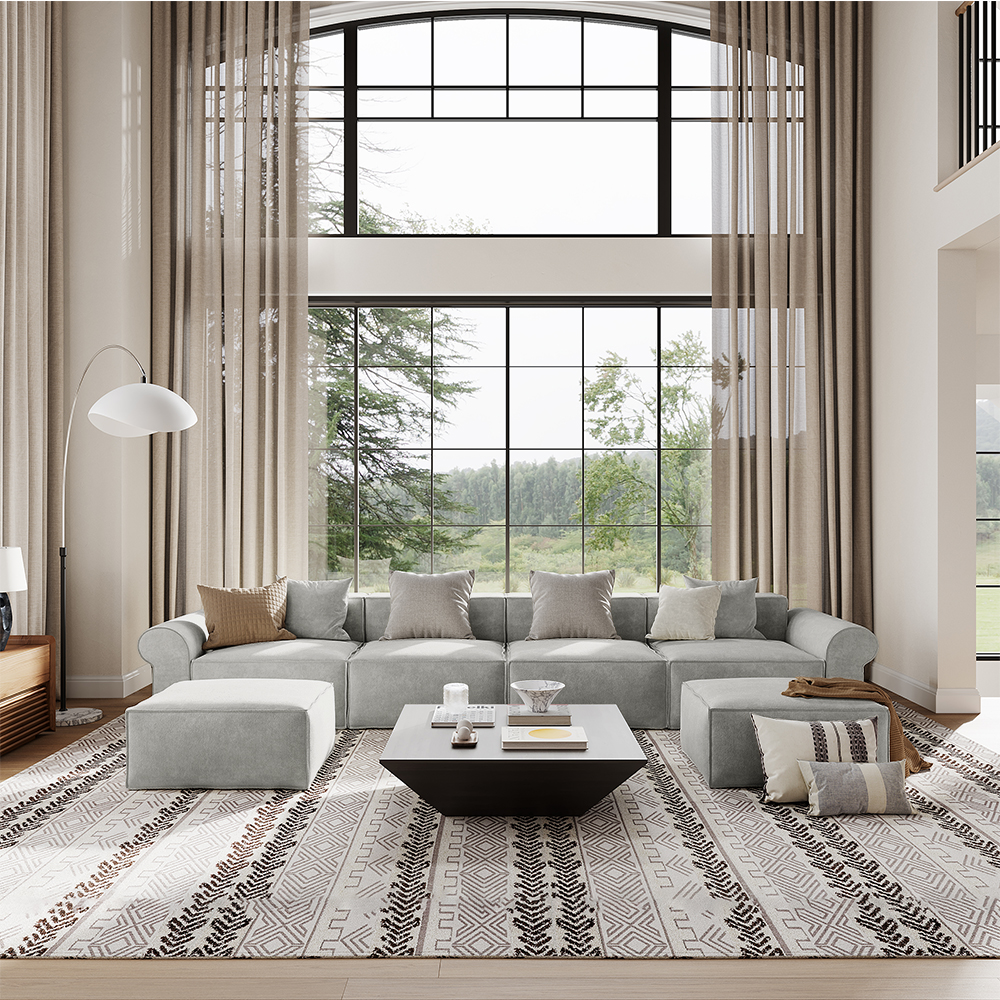 145.66" Roll Arm Modular Sofa with 2 Ottomans, Large Couch, Anti-scratch and Water-proof, Light Gray