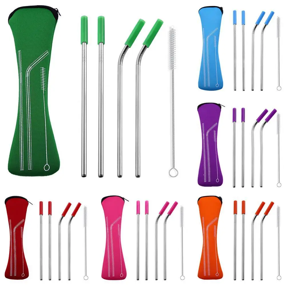 50%HOT4-Pack Reusable Silicone Tips Stainless Steel Straight Bend Smoothie Straws with Brush Rod Cocktail Straws Bar Drinking Ac