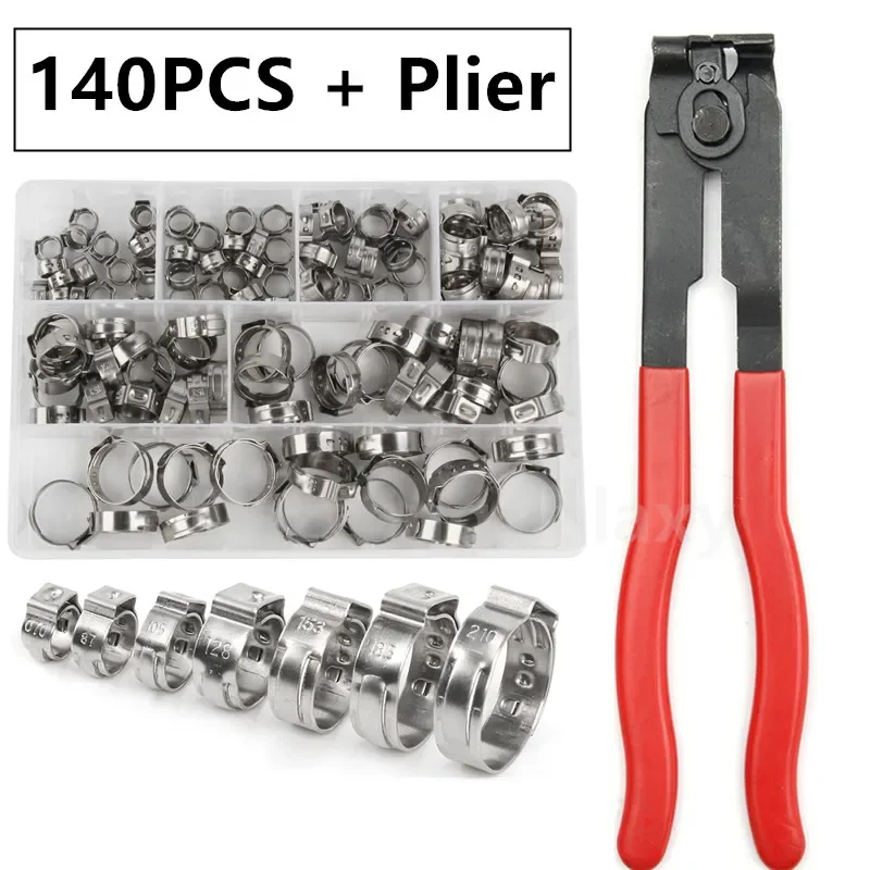 140pcs Single Ear Stepless Hose Clamps 7-21mm 304 Stainless Steel Hose Clamps / 1PC Hose Clip Clamp Pliers Kit Assorted