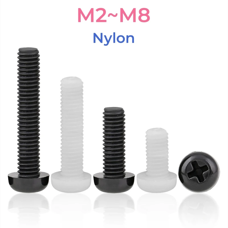 100/ 50/ 20pcs Metric Thread Black White Nylon Plastic Phillips Pan Head Cross Round Screw Bolt L= 4-60mm M2 M2.5 M3 M4 M5 M6 M8