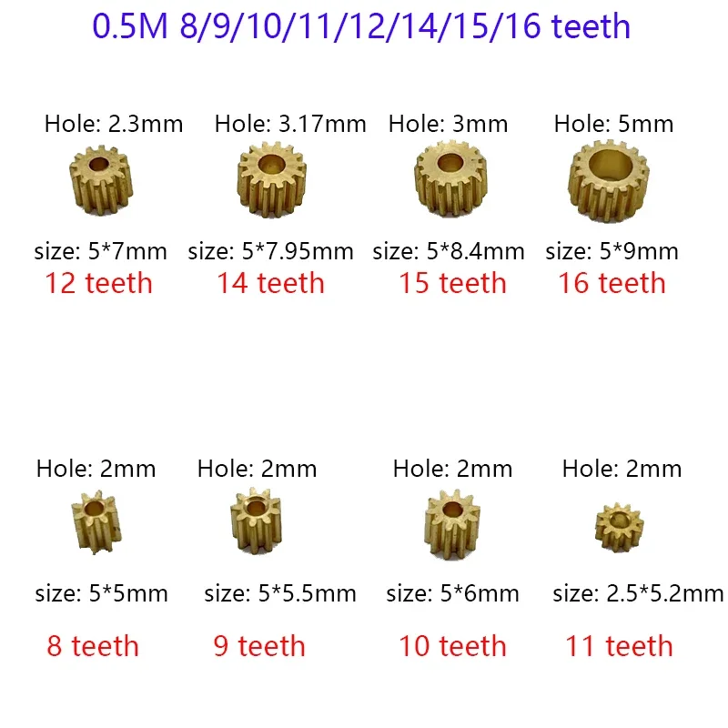 0.5M Modulus Motor Brass Gear 8/9/10/11/12/14/15/16 Teeth Metal Gear Fit 2mm 2.3mm 3mm 5mm Shaft for 130/380/555/775 motor
