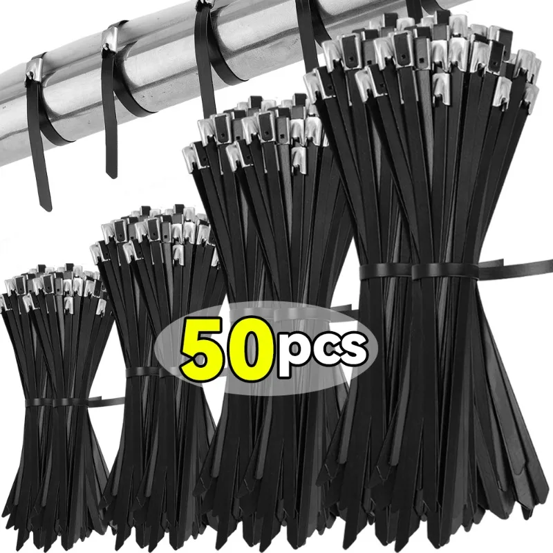 10/20/30/50pcs Stainless Steel Cable Ties Metal Self-locking Fastening Straps Black Heavy Duty Cable Wire Tie Exhaust Wrap Rings