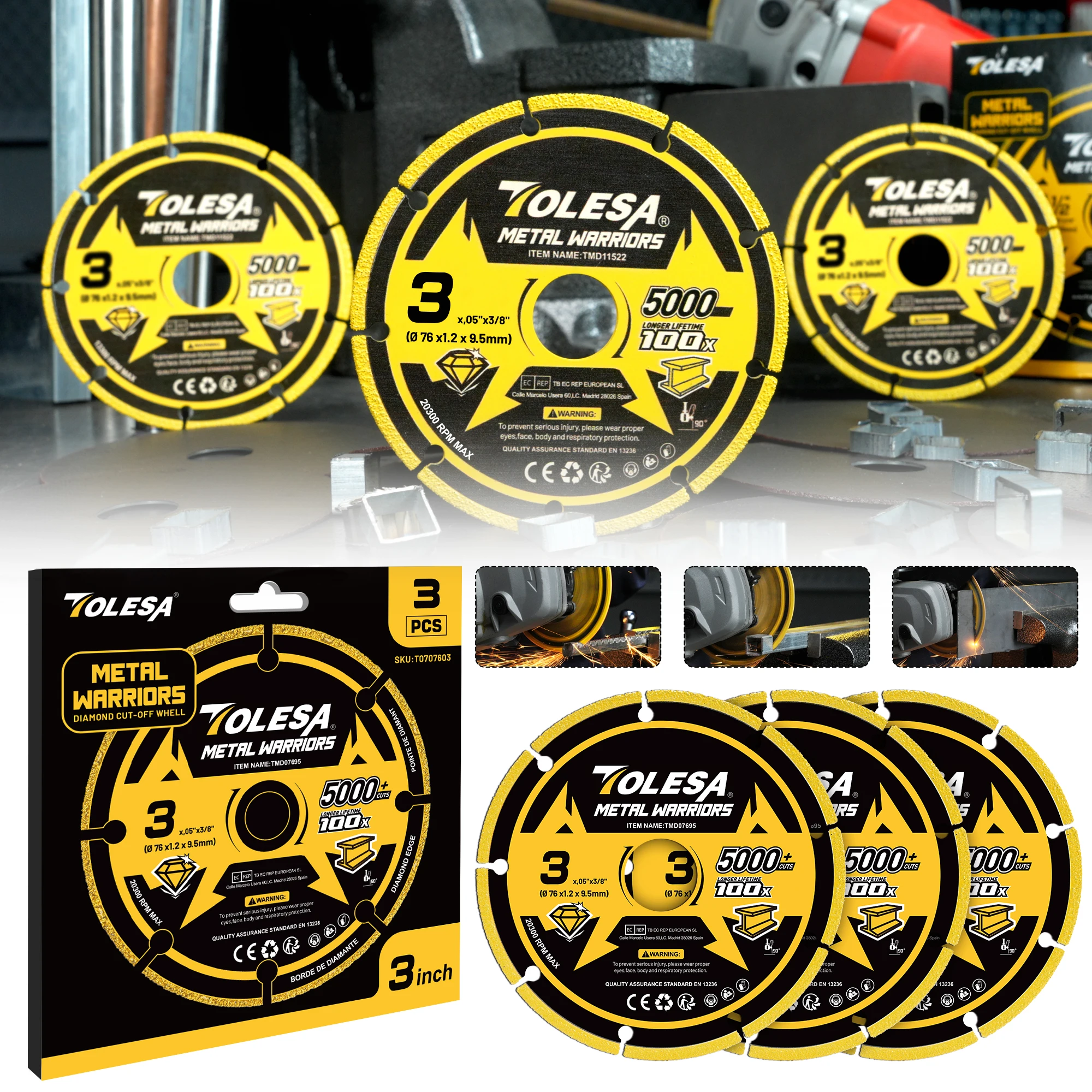 TOLESA 3Pcs Diamond Cutting Wheel 3 x 3/8 Inch Cut Off Wheel with 5000+ Cuts for Metal, Rebar, Steel, Iron and INOX