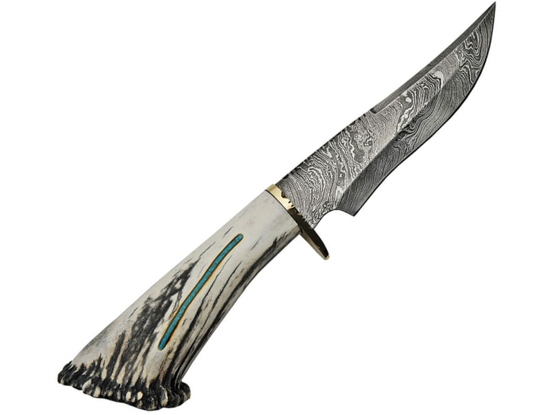 Rite Edge Skinner Knife 6.5" Damascus steel skinner blade Elk stag handle with turquoise inlay RU-EKDMB3