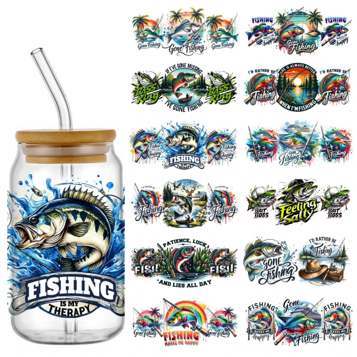 UV DTF Go Fishing Design Transfer Sticker For 16oz Glass Libbey Cup Wraps Can Bottle Selfadhesive Washable DIY Custom
