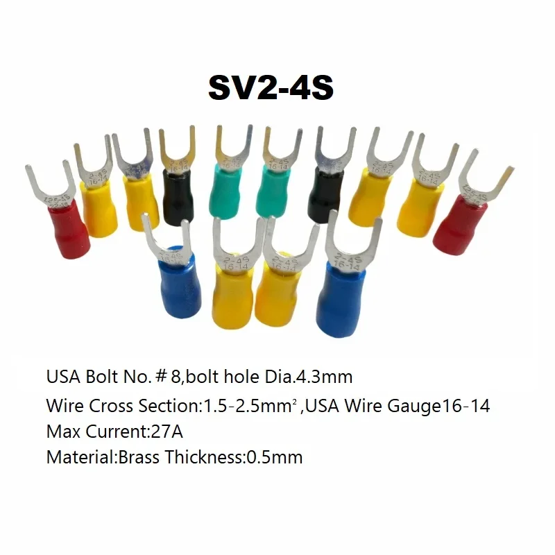 50PCS SV2-4S Insulated Cable Lug For Wire 1.5-2.5mm² AWG16-14 Brass Electrical Connector Crimp Terminal Bolt No.#8 Hole Dia.4.3