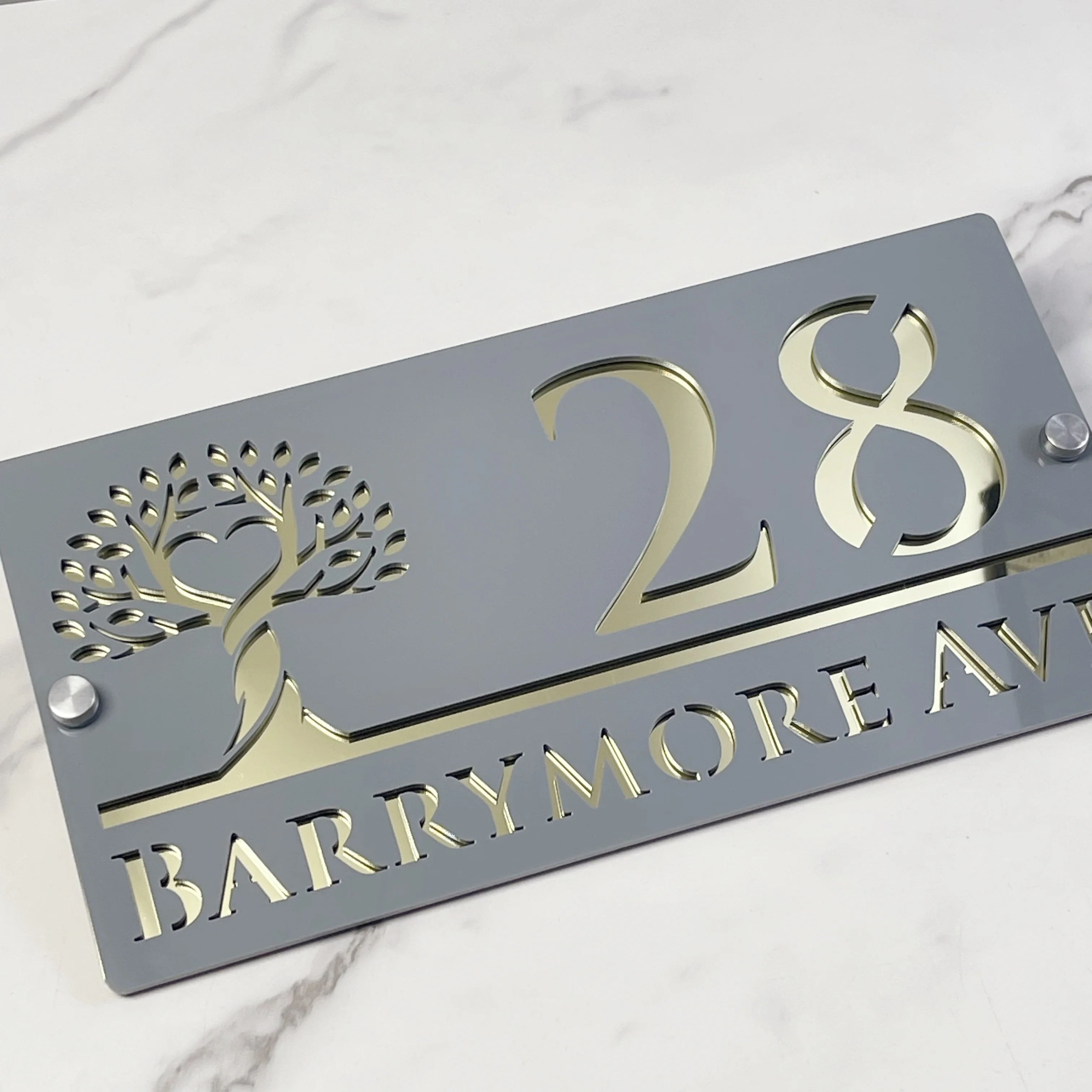 Tree of Life House Number Sign Customized Grey Gold 3D Acrylic Plaque Laser Cut Modern Address Plate for Outdoor Home Decoration