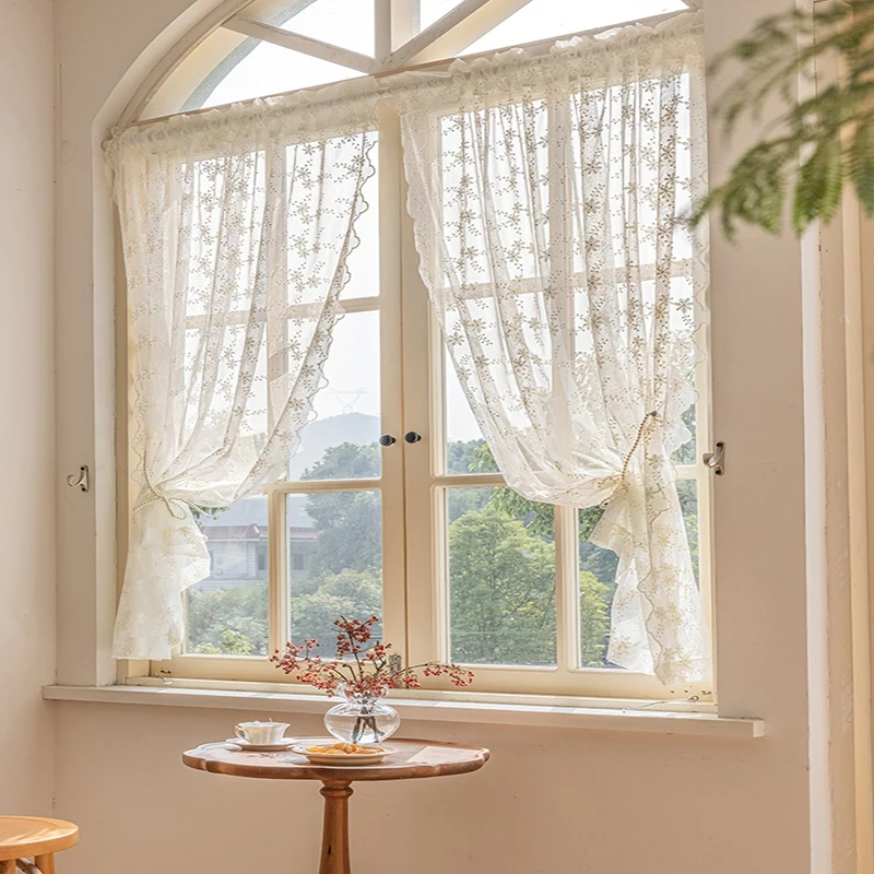 Lace Kitchen Curtain Swaying Beige Sheer Curtains for Living Room Bedroom Window Treatment Short Vintage Floral Embroidery 1 PC