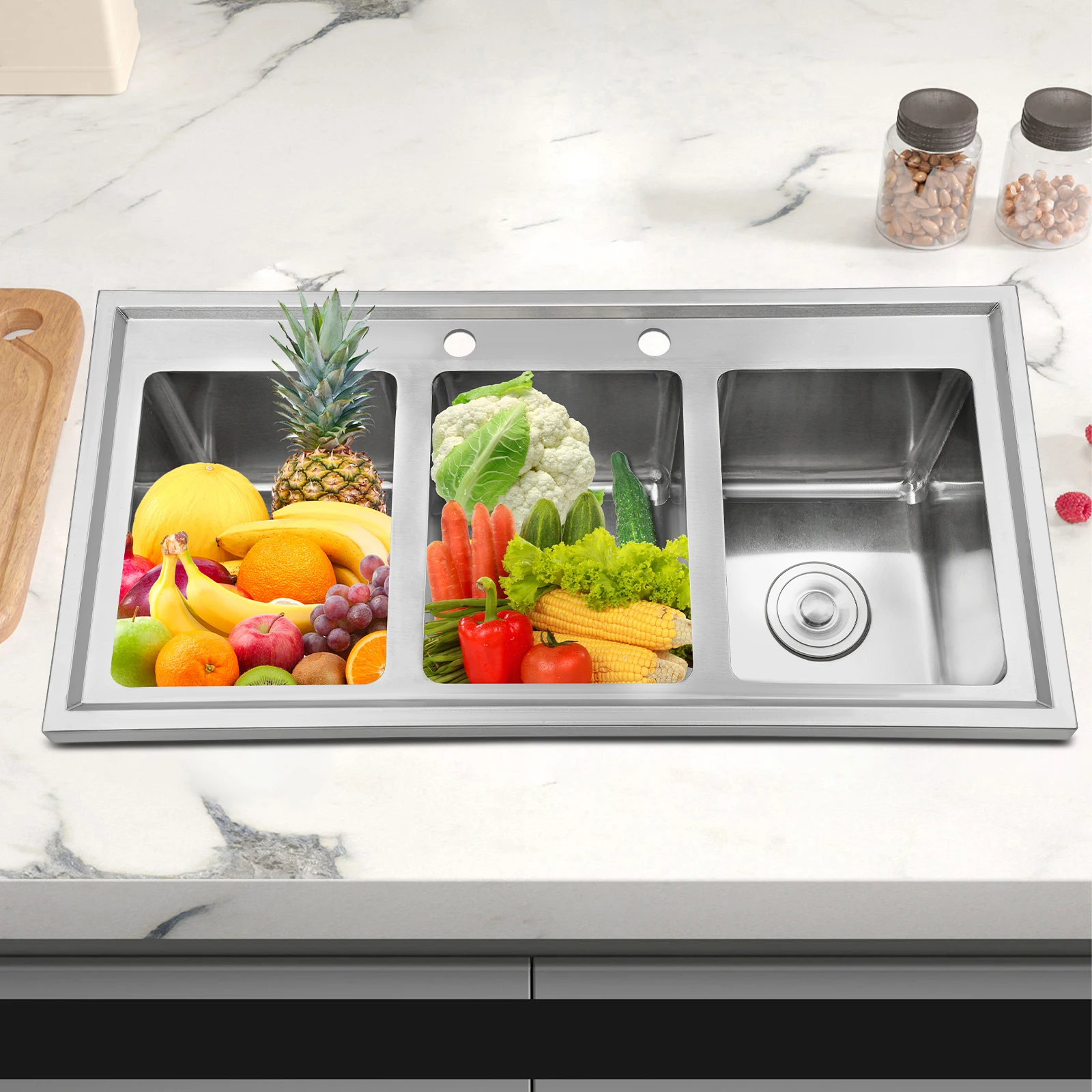 3 Compartment Silver Commercial Kitchen Sink, 201 Stainless Steel Triple Bowl Sink, 94x47x25.4cm Bar Prep Sink W/ 3 Drain Pipes