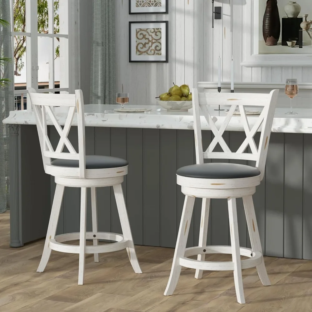 24 Inch High Back Swivel Bar Stools with Upholstered Seats and Solid Wood Footrests