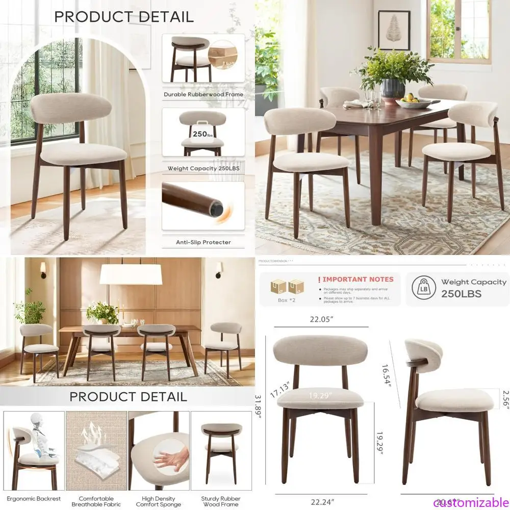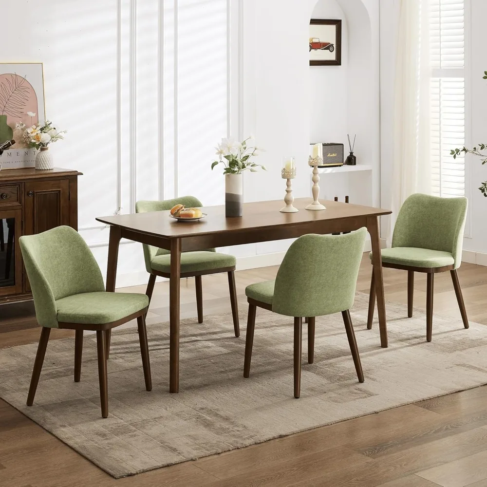 Mid Century Modern Dining Chair Set of 4, Farmhouse Linen Upholstered Curved Back Dining Chairs with Hardwood Frame