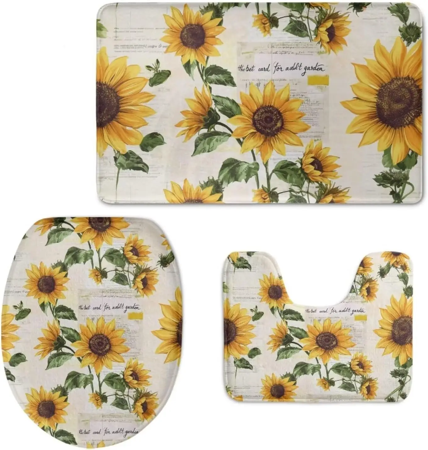 3PCS Sunflower Newspaper Bath Set, Vintage Print U-Shape Toilet Cover + Lid, Absorbent Non-Slip Washable Bathroom Decor