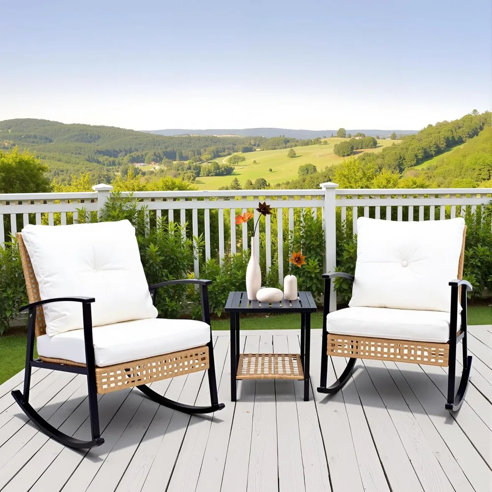 3-Piece Outdoor Rocking Chair Set, Wicker Patio Rocker Furniture with White Cushions, Side Table, Black Metal Frame – Ideal for