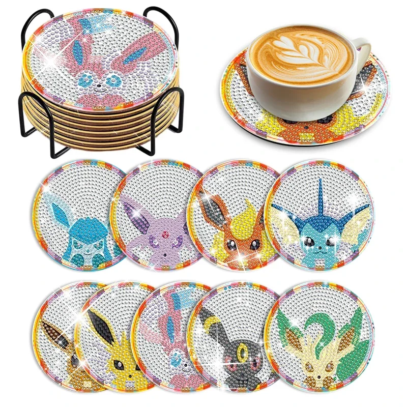 8Pcs Pokemon Diamond Painting Coasters DIY Cartoon Diamond Art Mosaic Drink Cup Pad Table Placemat with Holder Craft Decor Gift