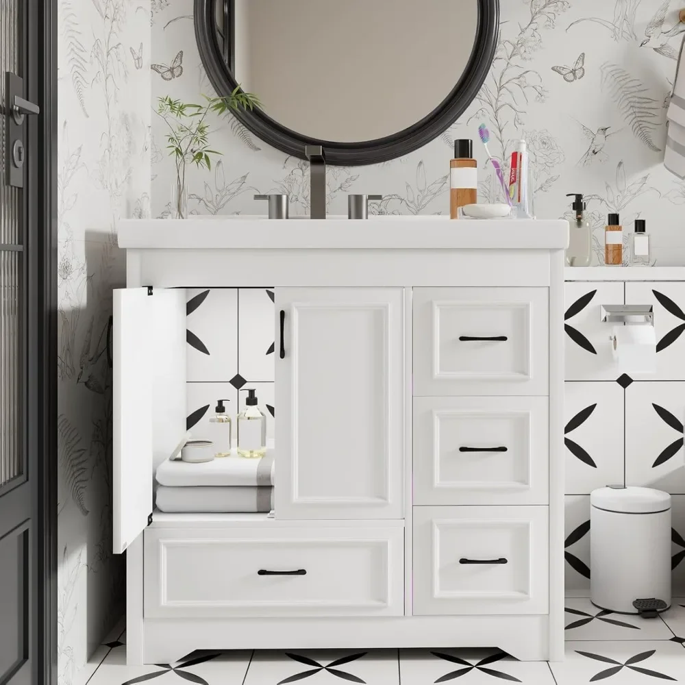 36 Inch Bathroom cabinet with Sink, Bathroom Sink Cabinet with 2 Doors, 4 Drawers, Ceramic Basin (No Faucet)