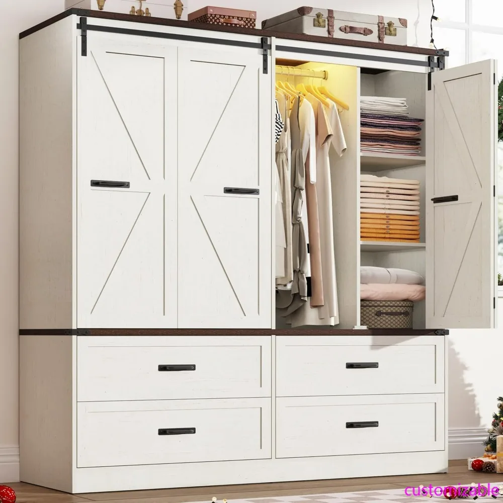 LED-Illuminated Sliding Barn Door Armoire with Drawers for Bedroom Storage