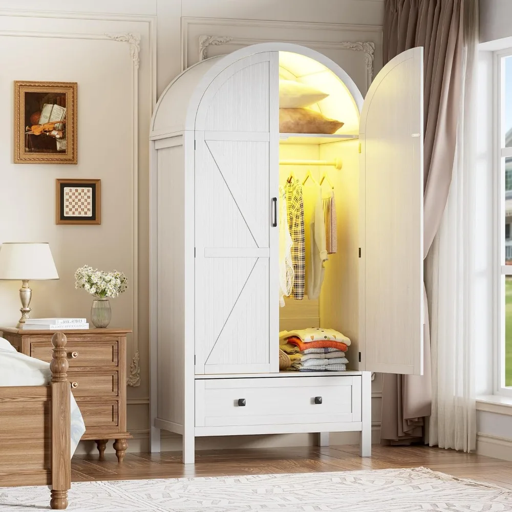 Armoire Wardrobe Closet with Drawers and 2 Arched Fluted Doors, 70.9‘’ Tall Wooden Bedroom Armoire with LED Light & She