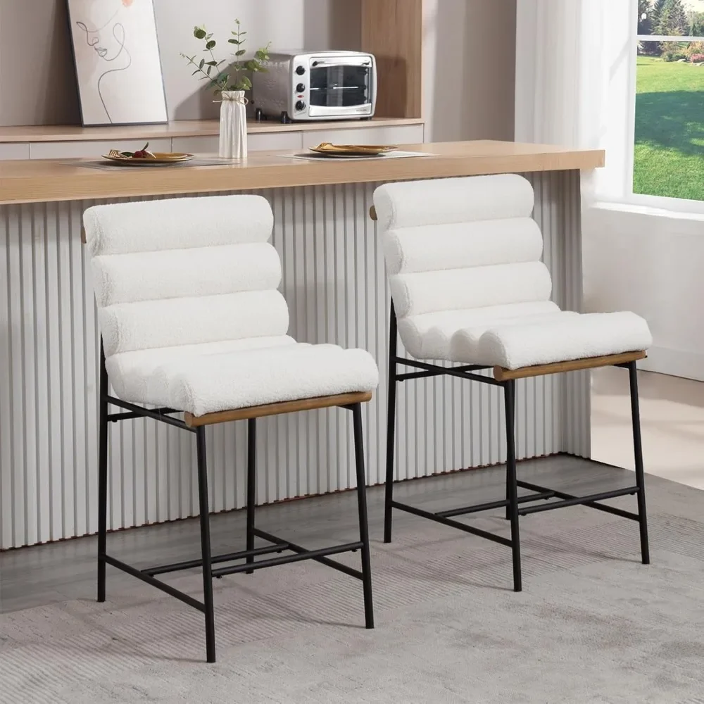 Modern Upholstered Bar Stool Set of 2 25-Inch Counter Height Chairs with Black Metal Legs Sherpa Fabric Kitchen Island Stools