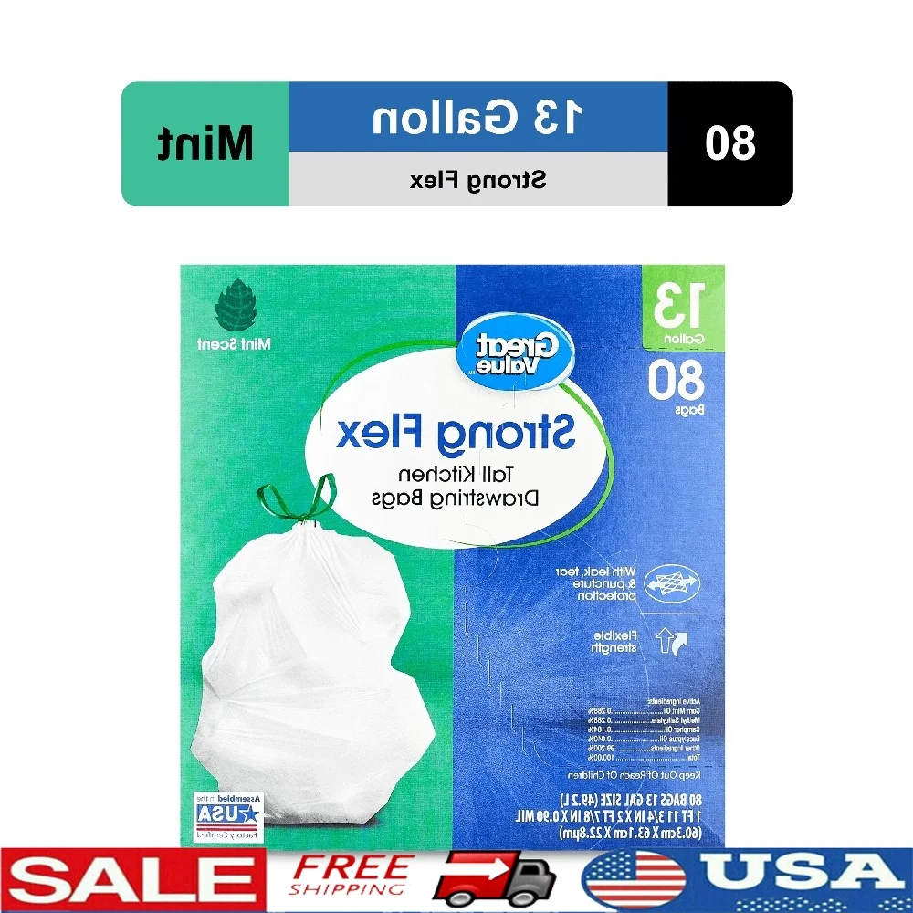 Strong Flex Mint Scented 13 Gallon Kitchen Drawstring Trash Bags 80 Count Leak Tear Puncture Protection Household Cleaning