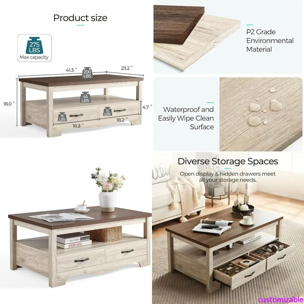 Living Room Coffee Table with Storage, Wooden Farmhouse Style Table featuring Open Shelves and Drawers
