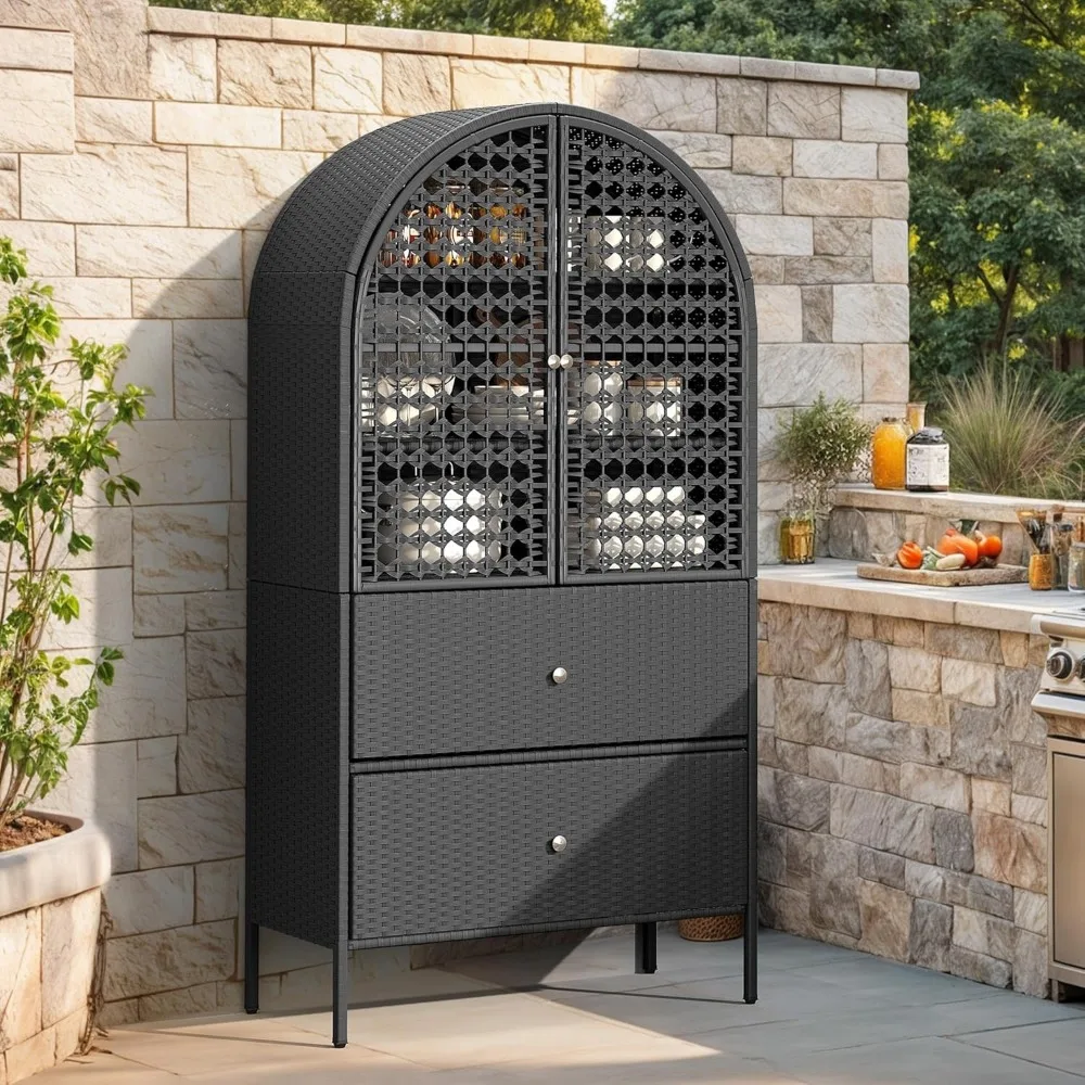 YITAHOME 65 Inch Outdoor Storage Shed, Arched Wicker Stand-Up Pantry with 3 Shelves & 2 Drawers, Rustic Storage Cabinet Patio Fu