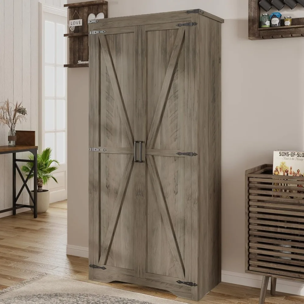 Farmhouse Rustic Grey Storage Cabinet with Adjustable Shelves, Large Pantry Organize with 2 Barn Doors, Tall Freestanding Cabinet