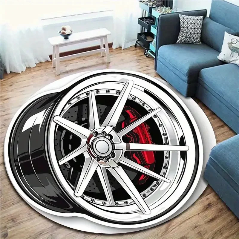 Silvery Black Wheels Printing Round Carpet Living Room Bedroom Kitchen Bathroom Floor Mat Soft Circle Rug Birthday Decor