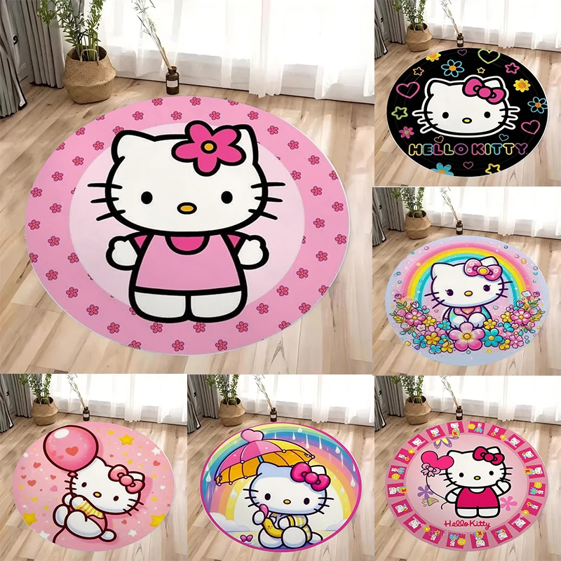 Hello Kitty Themed Round Area Rug Cute Hello Kitty Patterns with Rainbow Flowers Hearts Star Designs Soft Carpet for Living Room
