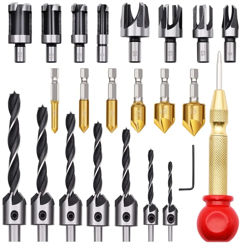 23 Pcs Woodworking Chamfer Drilling Tool Set, Includes Wood Plug Cutters, Countersink Drill Bits, L-Wrench, and Center Punch