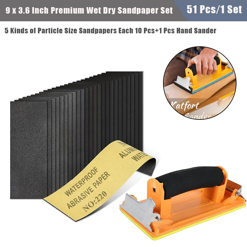51 Pcs (9 x 3.6 Inch) Wet/Dry Sandpaper Hand Sander Set Sanding Discs For Wood Sanding Metals Polishing Sheets Grinding Tools