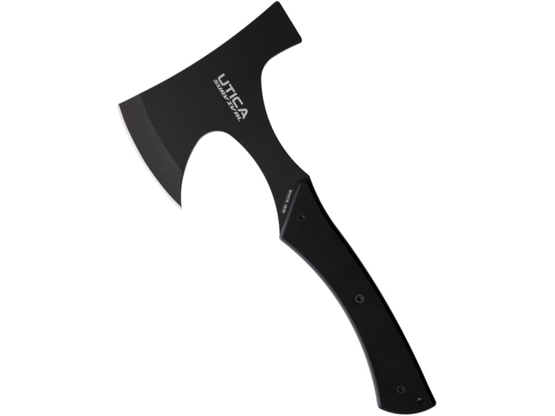 Utica Axe. 75" overall. 6.25" black powder coated stainless axe head with 4" cutting edge. Black G10 handle. Full tang. Lanyard hole. Black nylon belt sheath. Boxed. Specifications for Utica Axe: Manufacturer: Utica Blade Material: Stainless Steel...  Read more