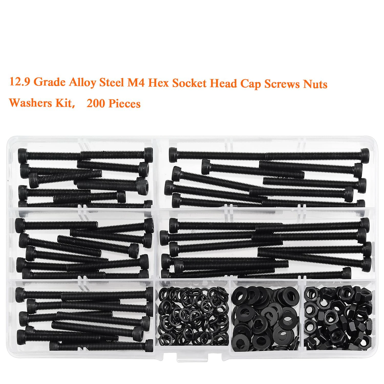 200 pieces of M4 x 30mm/35mm/40mm/45mm/50mm hexagon socket set screws bolts washers nuts kits, grade 12.9 alloy steel, fully thr  Read more