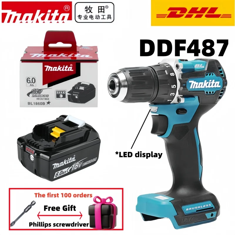Makita Original DDF487 Cordless Driver Drill Brushless Electric Impact Screwdriver 18V Rechargeable Power Tool