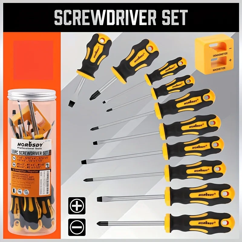 11PCS Magnetic Screwdriver Set Cross And Flat Head Professional Cushioned Grip Handle Demagnetizing And Remagnetizing Function