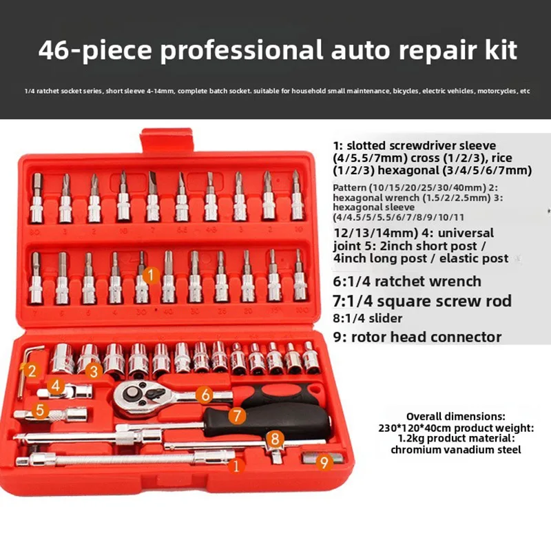 46pcs 1/4 Inch Drive Socket Set for Motor Ratchet Wrench Set Motorcycle Tool Kit, Bit Socket Wrench Set Metric Mechanic Tool Set