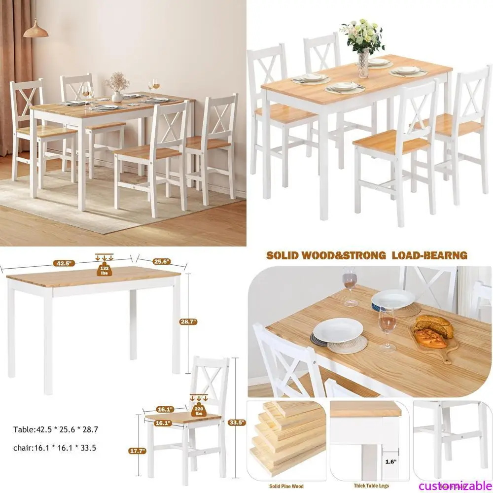 Pine Wood 5-Piece Dining Set for 4, 42.5 Inch Table and Chairs for Small Spaces