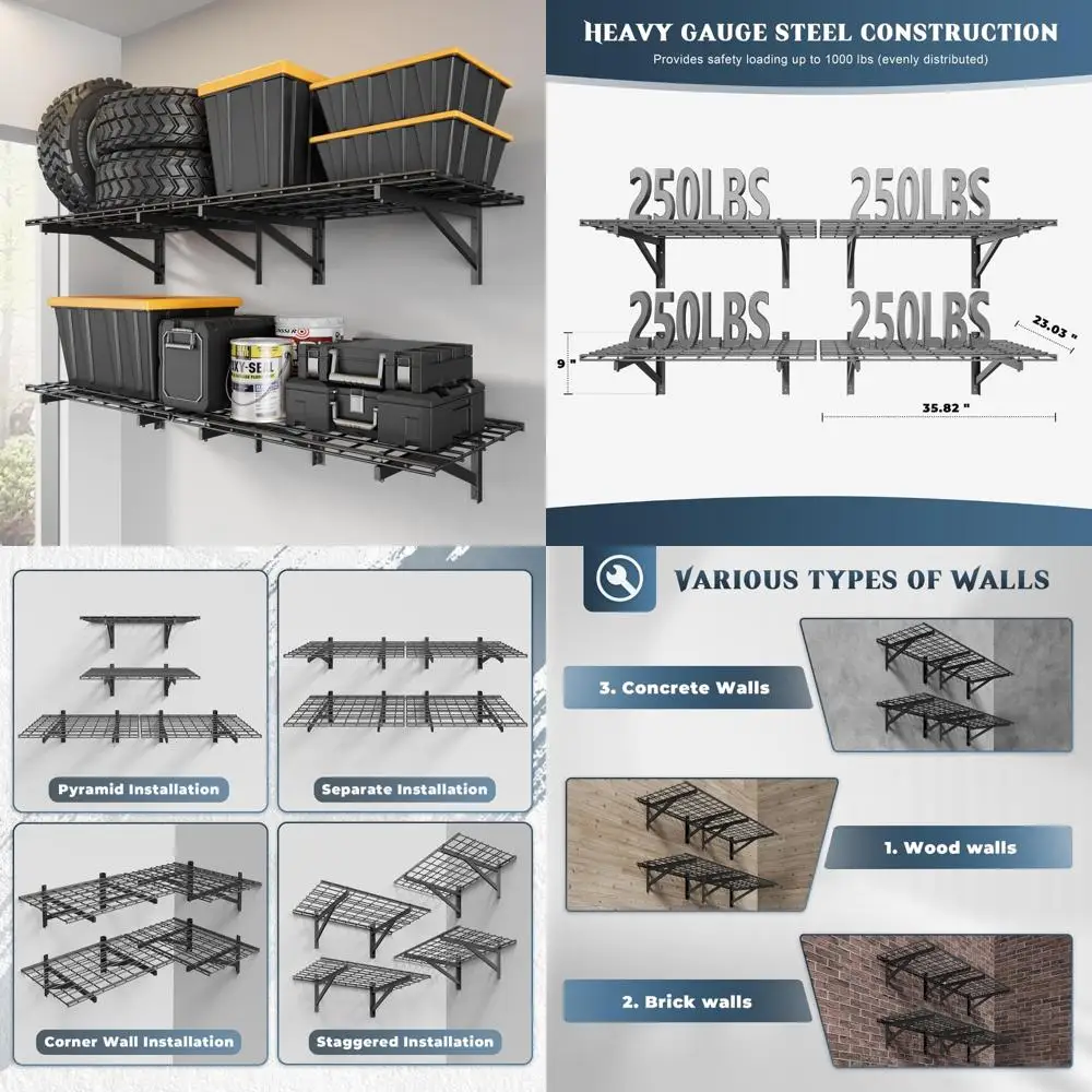 Sturdy 4-Piece Garage Wall Shelving System, 2x3ft Mounted Storage Racks with 1000lbs Load Capacity, 24x72 Inch Floating Shelves