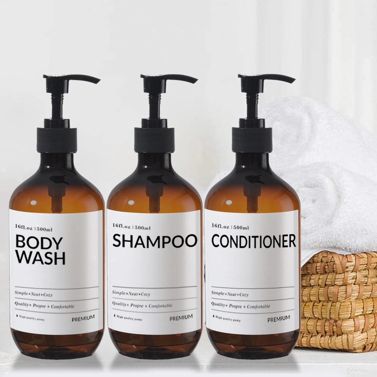 3Pcs Bath Shampoo and Conditioner Bottle with Waterproof Label Bamboo Pump Shower Body Wash Lotion Container