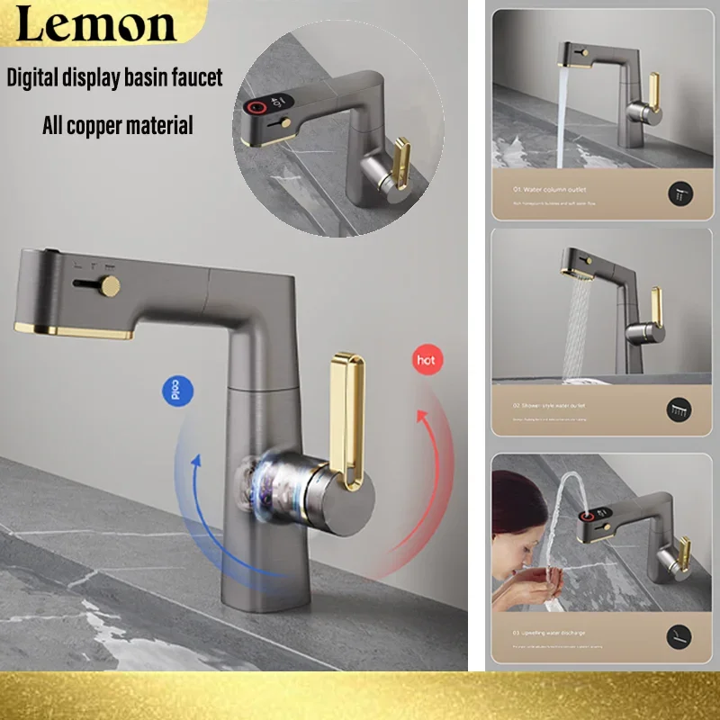 Lemon - Multifunctional Pull out Bathroom Faucet 360° Rotation LED Temperature Display Basin Mixer Sink Crane Tap Brass White  Read more