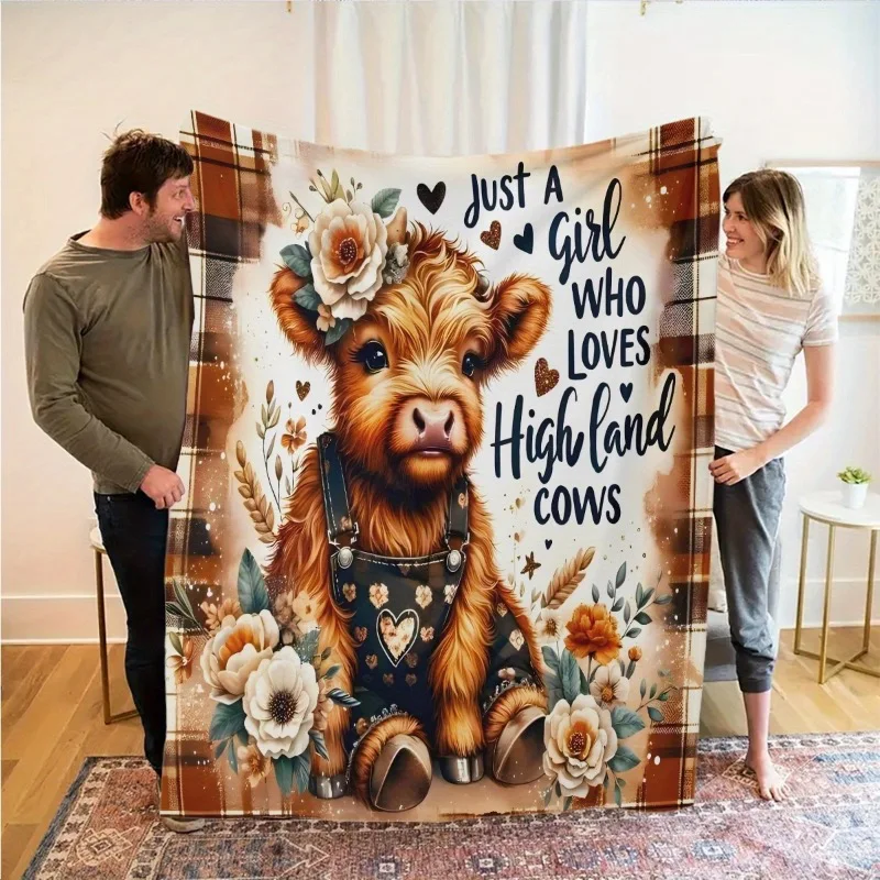 1pc Bohemian Highland Cow Flannel Blanket - Floral & Heart Print Soft All-Season Throw for Camping Sofa Bed