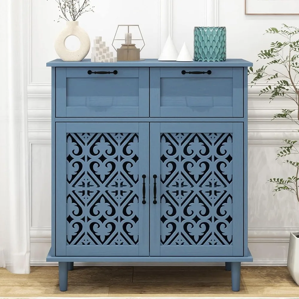 2 Door 2 Drawer Accent Cabinet with Hollow Carved Doors, 31.5" Buffet Sideboard with Solid Wood Legs, Wood Storage Cabinet for L