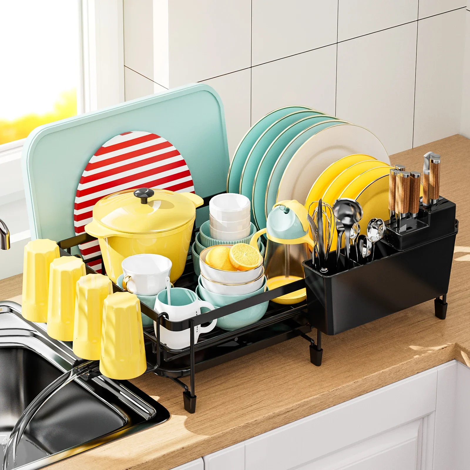 Expandable Dish Drying Rack Dish Racks for Kitchen Counter Adjustable Spout Dish Strainers with Utensil Holder Knife Slots
