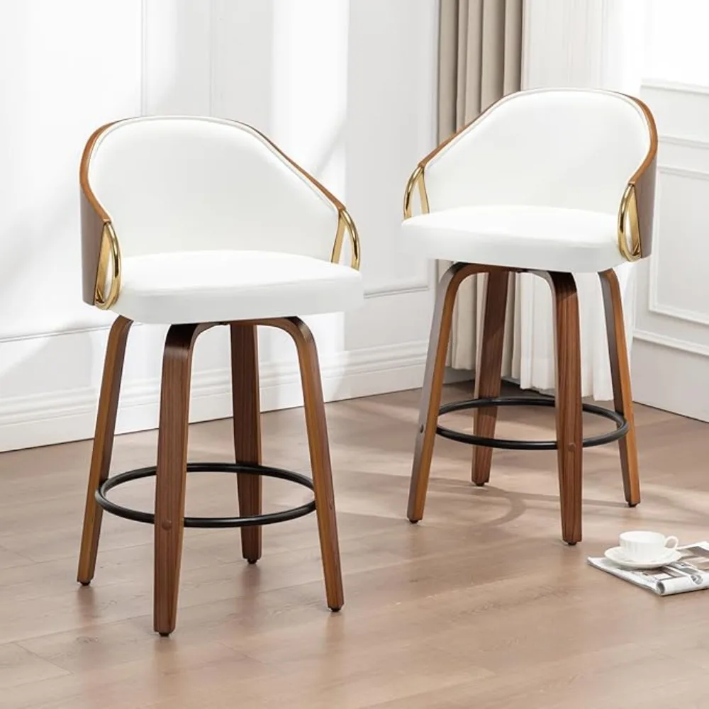 24.8" Swivel Counter Height Bar Stools Set of 2, White Leather Barstools Mid Century Modern Bar Chairs with Wood Legs and Golden