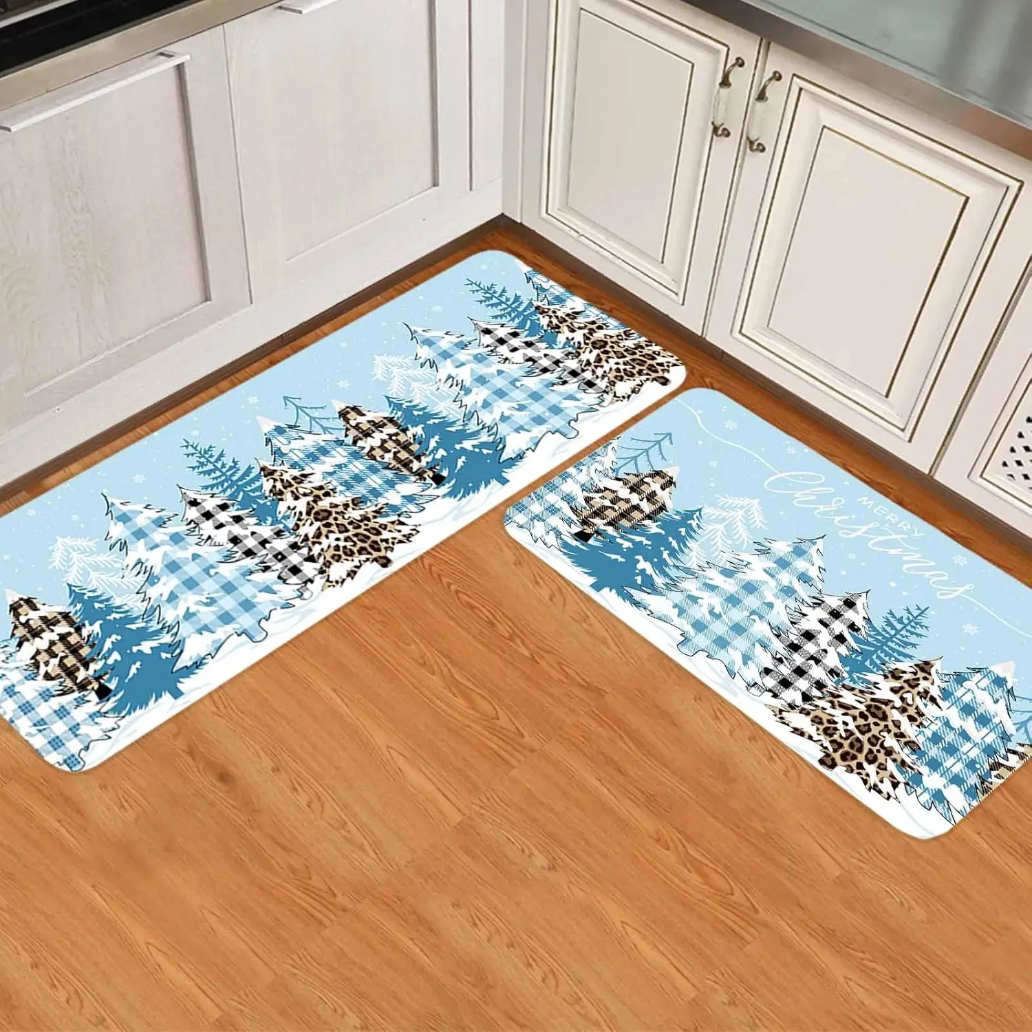 Merry Christmas Blue Xmas Tree Plaid Kitchen Mat Entrance Non-slip Door Mat Bedroom Balcony Hallway Rugs Christmas Decorations