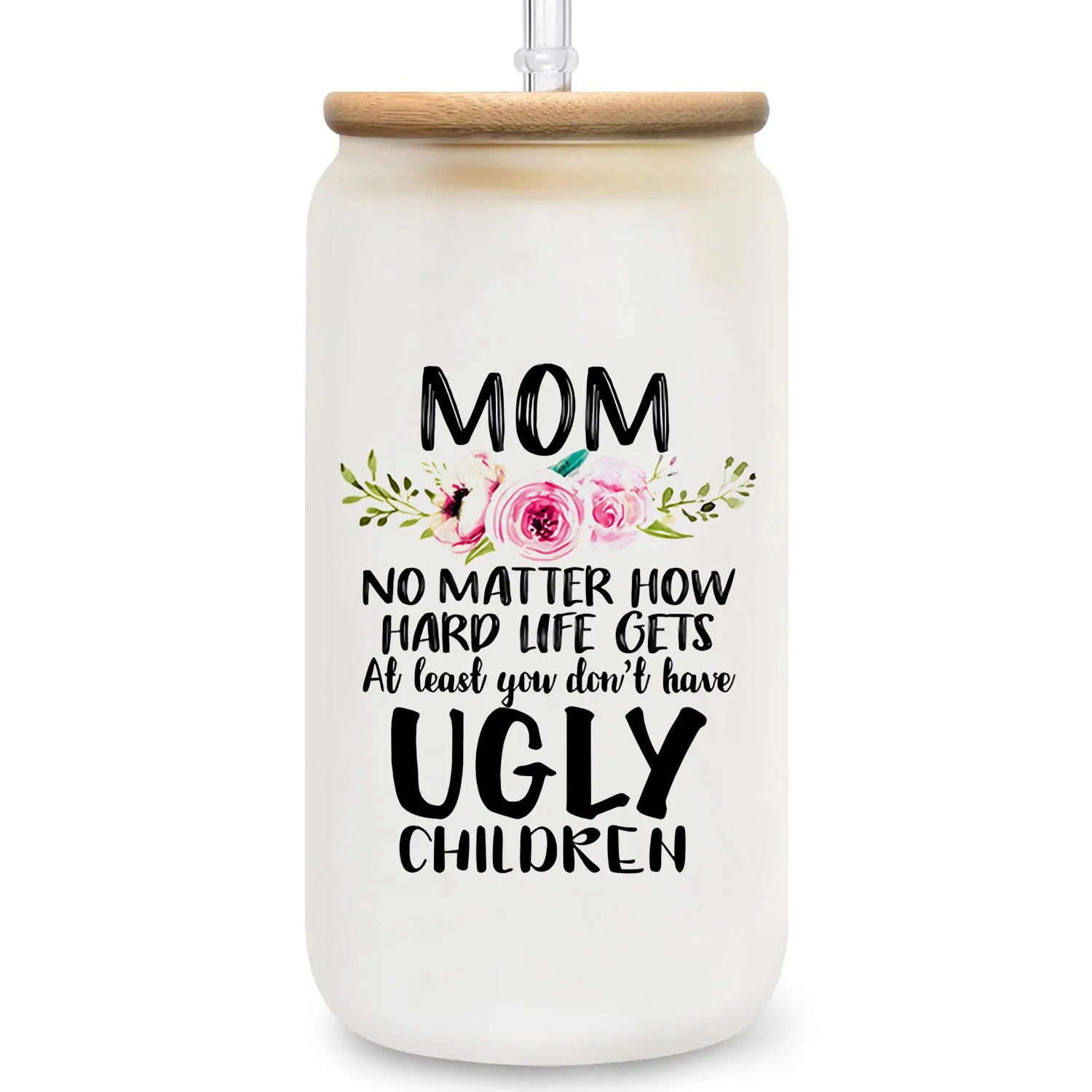Glass Coffee Cups for mother, 16oz Glass Can With Bamboo Lids And Straw Coffee Cup Great Gift For Holiday Birthday Mother's Day.