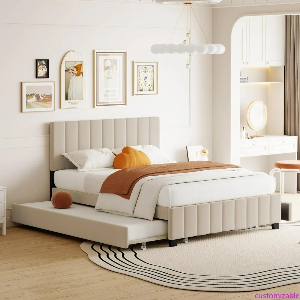 Beige Merax Queen Upholstered Platform Bed with Storage Drawers and Twin XL Trundle, No Box Spring Required