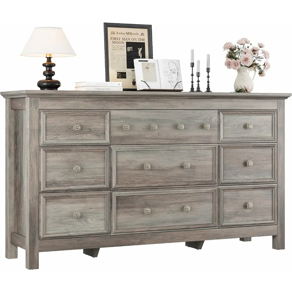 9 Drawer Dresser, 57" Large Dresser for Bedroom, Wood Chest of Drawers with Metal Handle, TV Stand for 70 inch TV